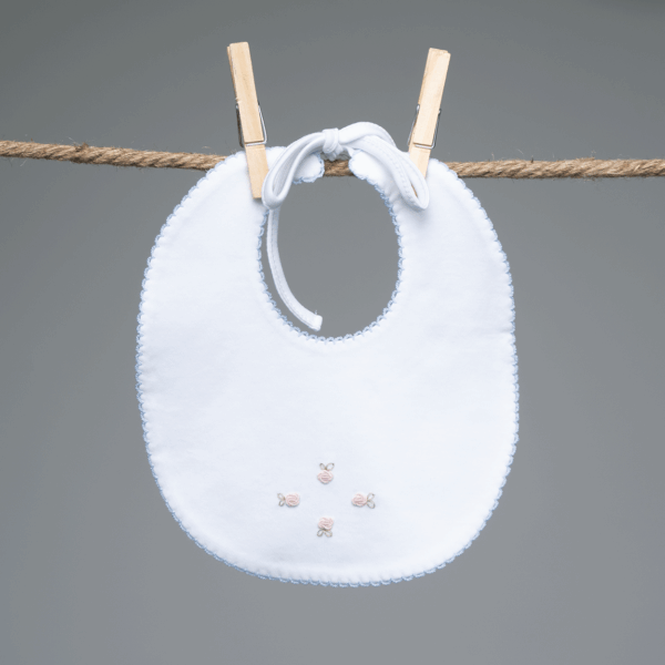 Babero blanco de algodón 100% pima. Picot celeste. Bordado de flores rosadas. Forrado en toalla por atrás. Para ser usado con el romper Inverness. Parte de las colecciones: Flores bordadas y Algodón pima baby.
