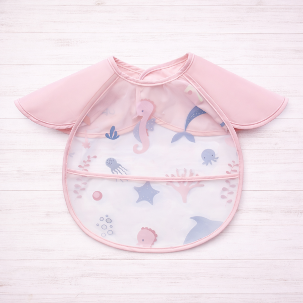 Babero para comer de plástico con dibujos de animales del mar en tonos rosados y grises. Se abrocha con un velcro al cuello.