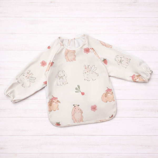 Babero para comer de plástico manga larga. se abrocha con un velcro al cuello. Color crema con flores rosadas y conejos en tonos neutros. Puño elasticado.