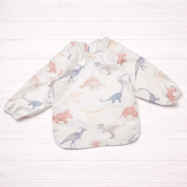 Babero para comer de plástico manga larga. se abrocha con un velcro al cuello. Color blanco con dibujo dinosaurio en tonos neutros. Puño elasticado.