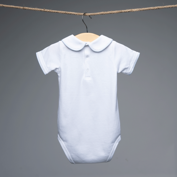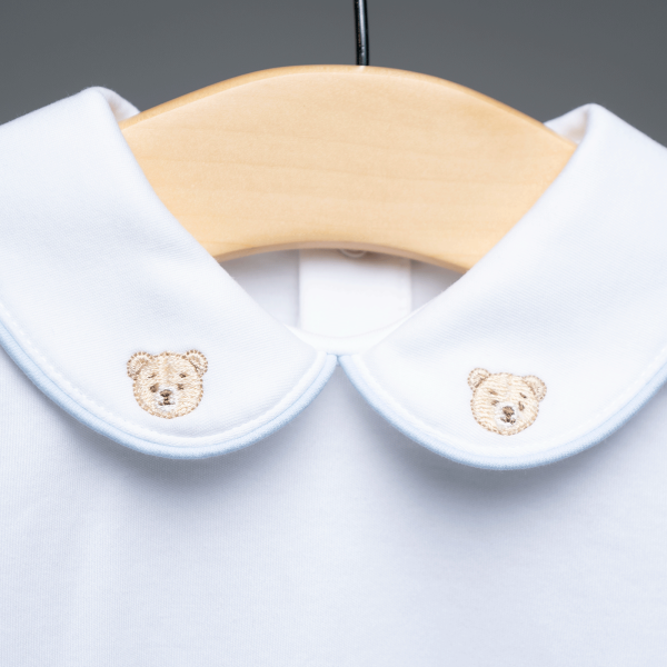 Body blanco 100% algodón pima peruano. Cuello Peter Pan, con detalle de oso bordado. Manga y cuello embolsado en celeste. Parte de la colección: Algodón pima baby