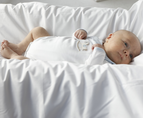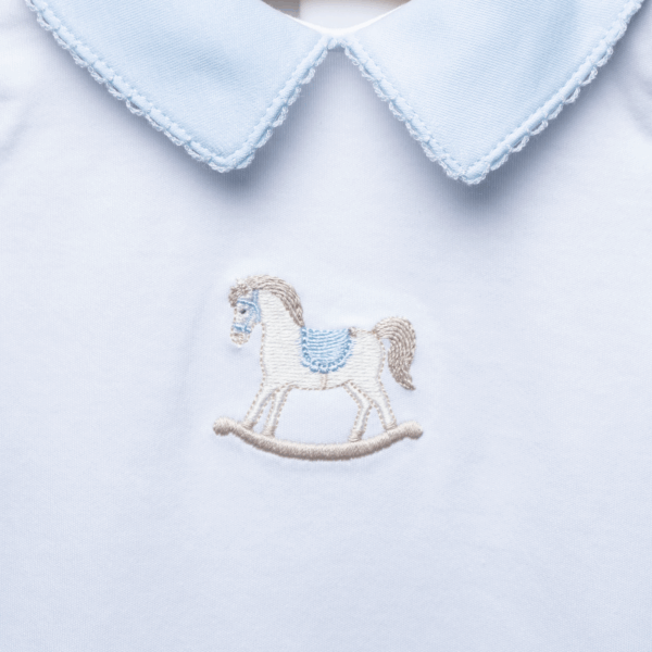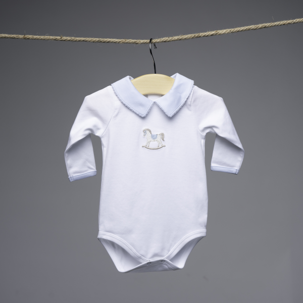Body blanco 100% algodón pima peruano. Cuello en punta. Puños y cuello celeste con picueta al tono. Bordado de caballo blanco balancín de 4 cm. Parte de la colección: Algodón pima baby