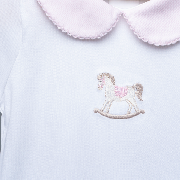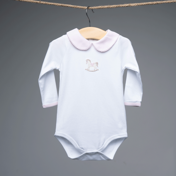 Body blanco 100% algodón pima peruano. Cuello Peter pan. Puños y cuello rosado con picueta al tono. Bordado de caballo blanco balancín de 4 cm. Parte de la colección: Algodón pima baby