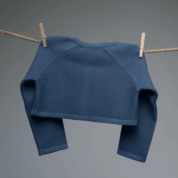 Sweater corto tipo rebeca en azul acero. Se abrocha con dos botones anacarados abajo del cuello. Confeccionado en Perú.