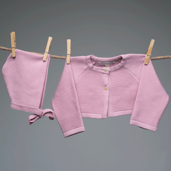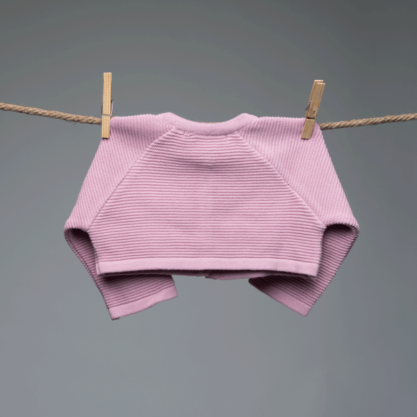 Sweater corto tipo rebeca en rosado. Se abrocha con dos botones anacarados abajo del cuello. Confeccionado en Perú.