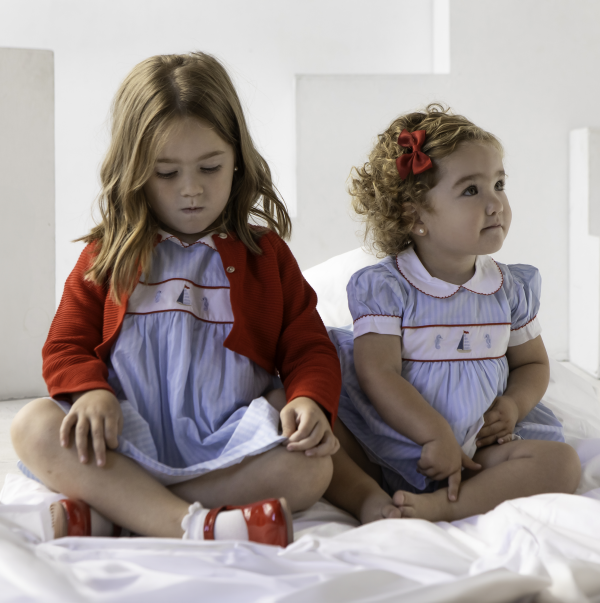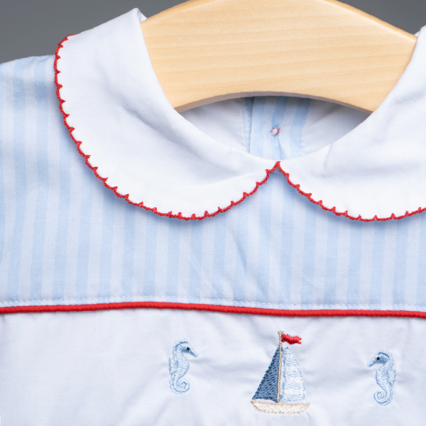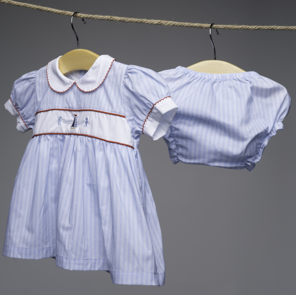 Vestido corto y cubrepañal en tela a rayas celeste. Bordados de velero y caballitos de mar al centro. Cuello peter pan blanco con picot rojo. Mangas englobadas con puño blanco y picot rojo. Parte de la colección: Marinera.