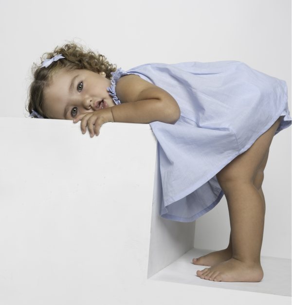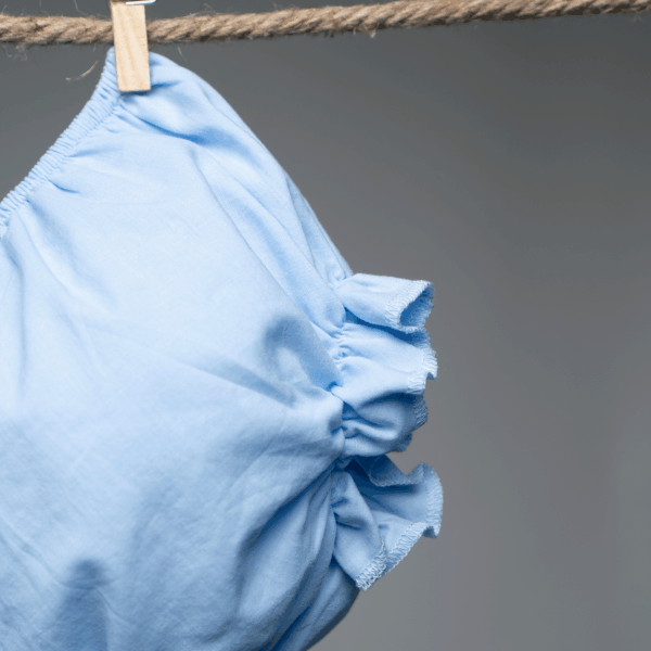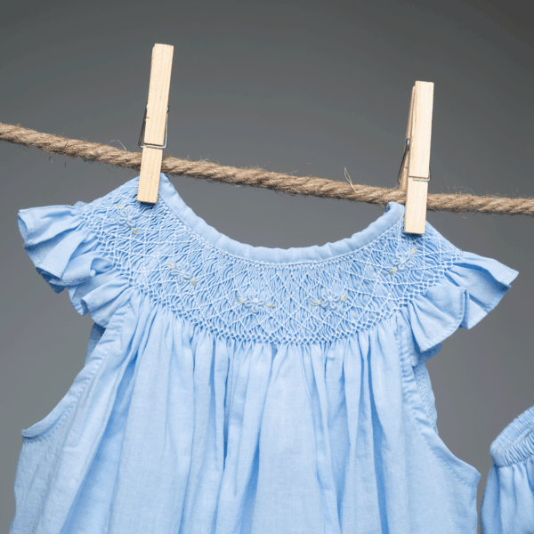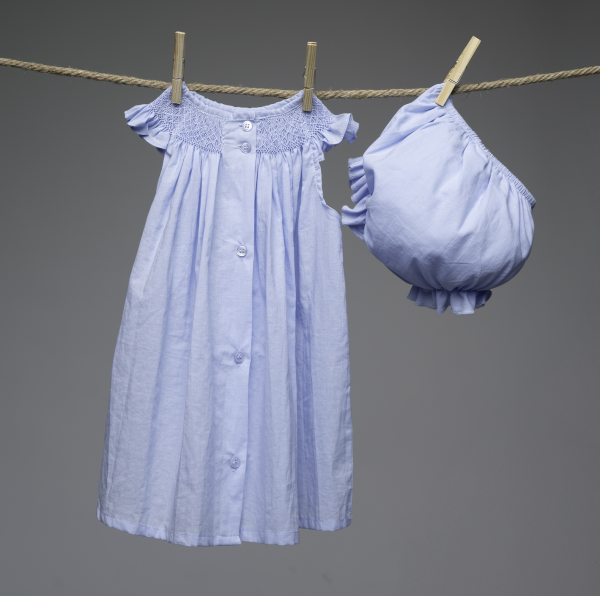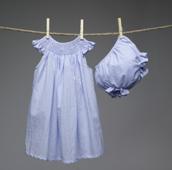 Vestido y cubrepañal en tela delgada celeste. Vestido cuello bishop: smock y bordado de flores hechas a mano en tono celeste. Manga mariposa. Botones en la espalda. Parte de la colección Flores bordadas.