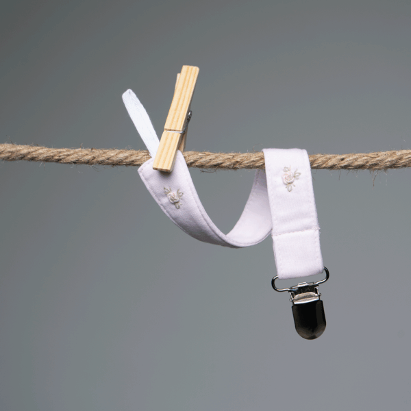 Portachupete rosado en tela algodón pima peruano 100%. Cuatro flores bordadas rosadas. Parte de las colecciones: Flores bordadas y Algodón pima baby.