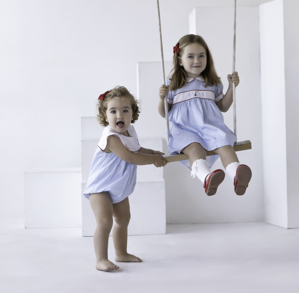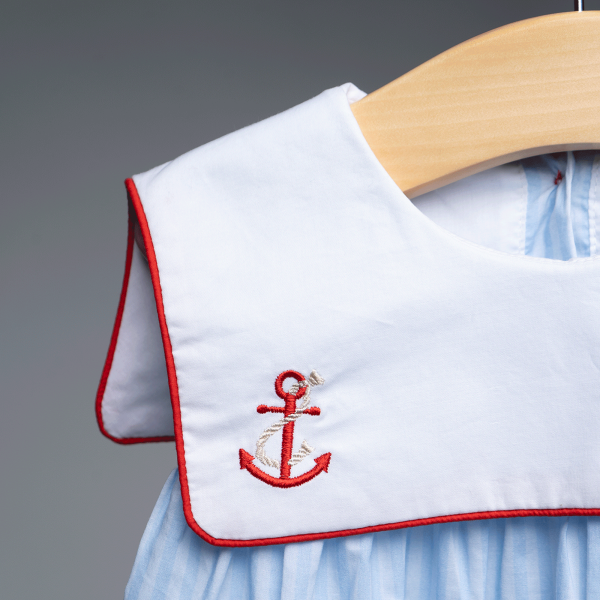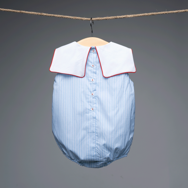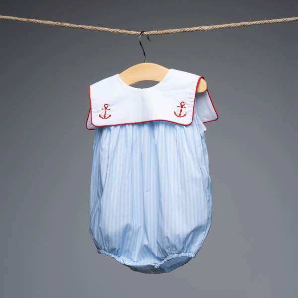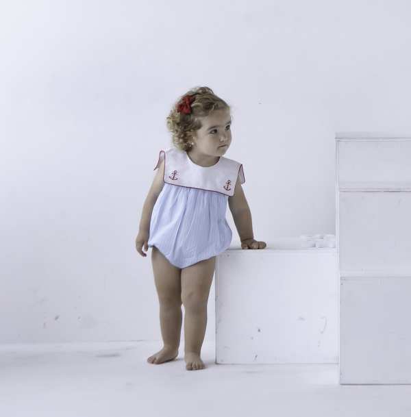 Enterito abombachado rayado en algodón pima peruano. Sin mangas. Cuello blanco con anclas bordadas. Muslo elasticado. Parte de la colección Marinera