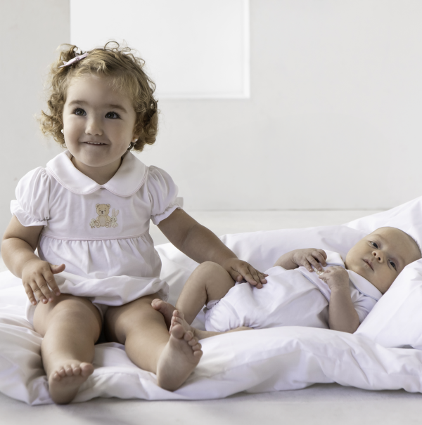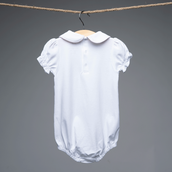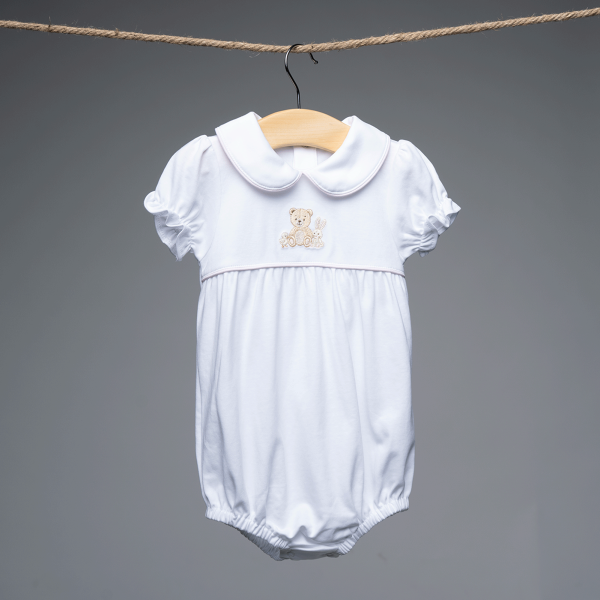 Romper blanco 100% algodón pima peruano. Cuello Peter Pan blanco con vivo rosado. Manga corta englobada. Trío de animales bordados al centro: pato, oso y conejo. Parte de la colección: Algodón pima baby