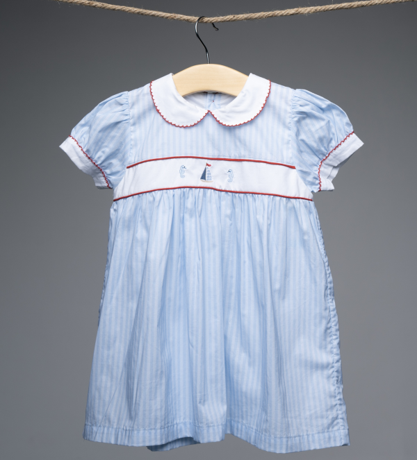 Vestido corto en tela a rayas celeste. Bordados de velero y caballitos de mar al centro. Cuello peter pan blanco con picot rojo. Mangas englobadas con puño blanco y picot rojo. Parte de la colección: Marinera.